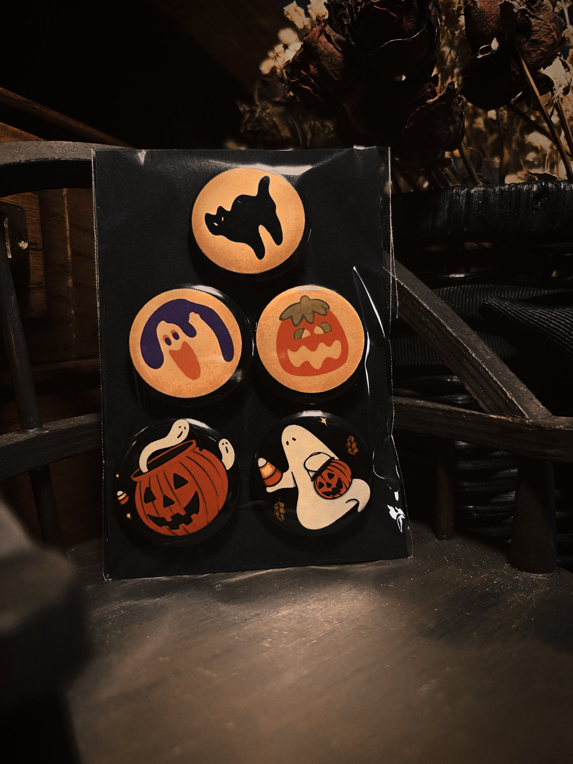 A spooky mystery box including (1) large 5x7 print , (2) 4x6 prints , and a set of 3 buttons !