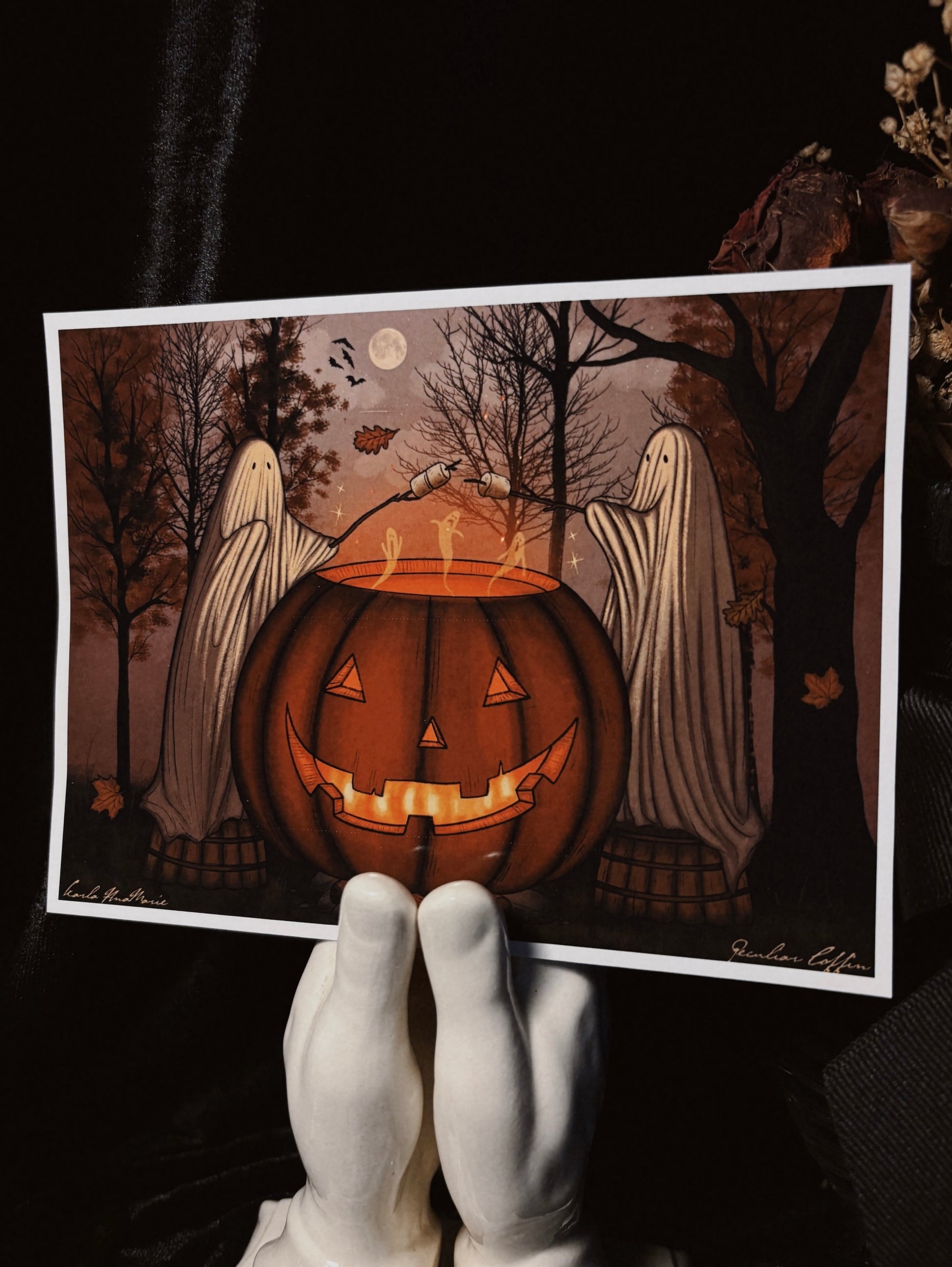 Two ghosts on a fall night , roasting marshmallows above a fiery roasting pumpkin while the leaves fall .