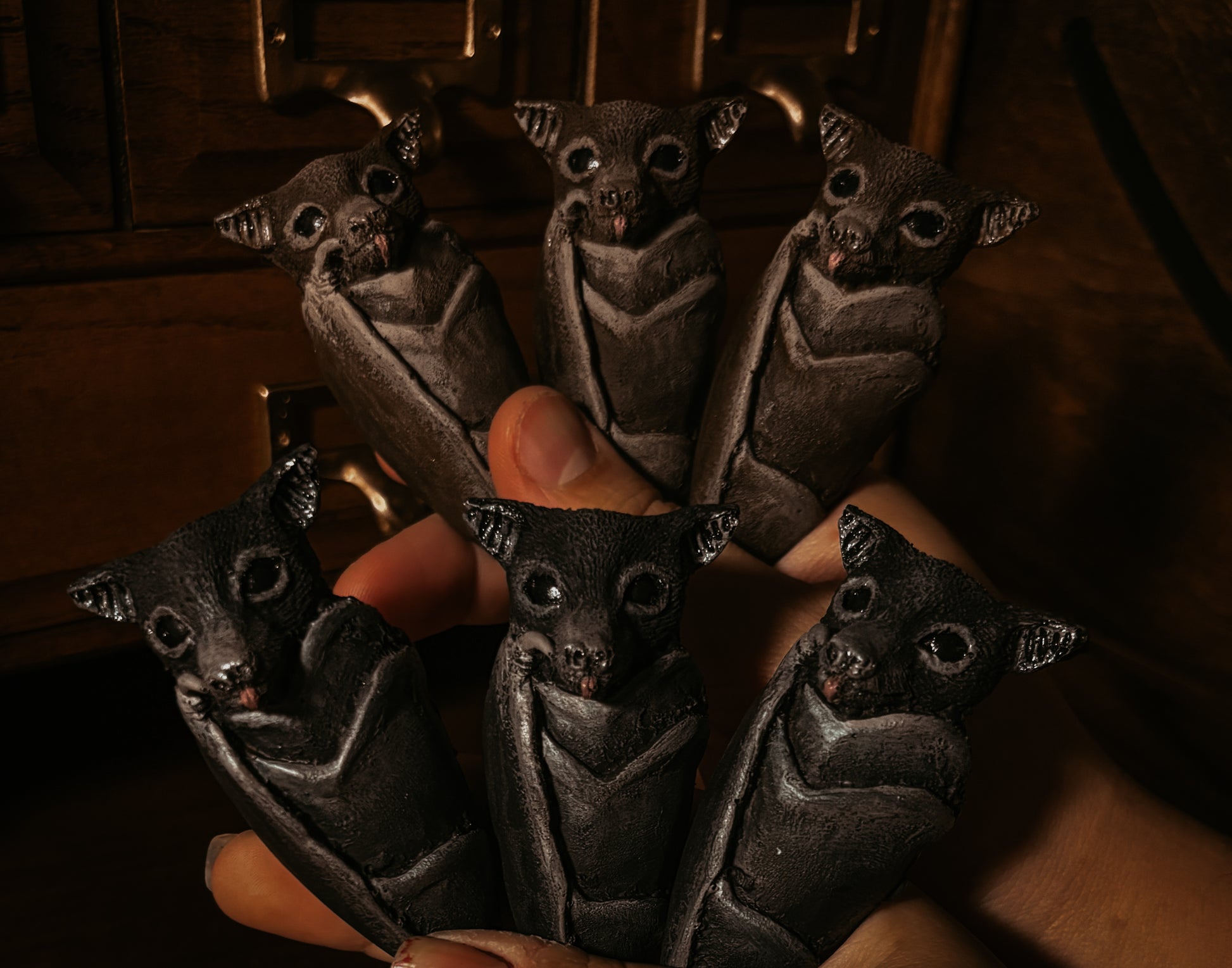 3.25 inch Black Baby Bat Ornaments ! These are made from a durable resin and hand painted with a velvet black ribbon to hang up. Each bat comes with its own mini box packaging and label .